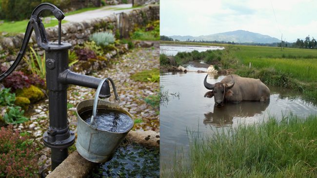 Pushing the long handle of the artesian well to draw up the water. Reaching up to clasp my small hands around the smooth metal handle, I would pull it down as far as I could. And as I cranked it up and down, I would hear the water gurgling in the pipes down below, then slowly rise up higher and nearer. Excitedly, I would crank the handle faster and faster, until suddenly, cool and clear water gushed out to drench dirty me.